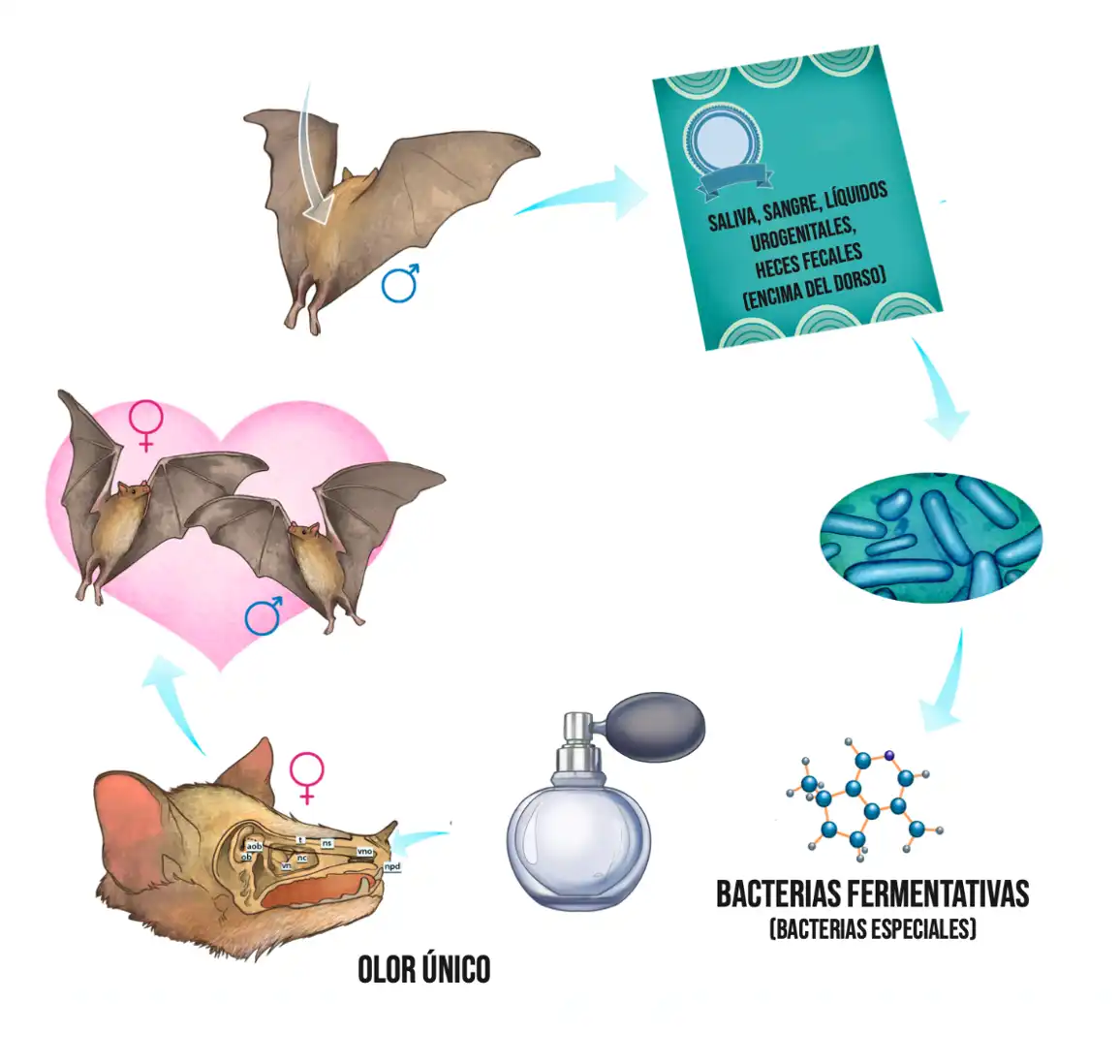En un estudio reciente nos hemos dado cuenta de que las bacterias influyen mucho en la atracción entre las parejas de una especie de murciélago que come néctar. Cuando los machos están listos para reproducirse, tienen una conducta particular: se ponen líquidos urogenitales en la espalda, con la ayuda de sus patas, en un lugar ubicado entre las alas. Antes de realizar este movimiento, el pelo de la espalda de estos murciélagos comienza a caerse, creándose una especie de herida con costras muy raras. Además, el individuo se pone saliva, excremento, orina y otros fluidos urogenitales. Al rascarse, les sale sangre, de manera que crea una superficie con una capa de nutrientes de los que se alimentan las bacterias. Lo que hemos encontrado en este “parche dorsal”, que es como lo denominan los científicos, es que, en este estado reproductivo, el murciélago polinizador de agaves, tiene un 65 % de bacterias que son fermentativas; es decir, que muy probablemente están desencadenando reacciones de ácidos grasos volátiles y olores que sirven para atraer a las hembras.