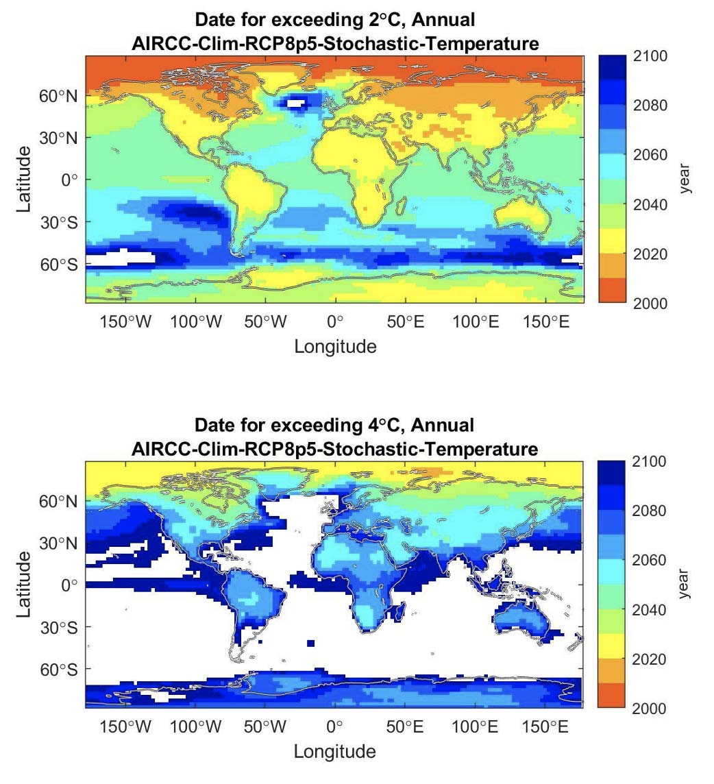Se considera que una gran parte de los ecosistemas difícilmente podrían adaptarse a aumentos superiores a 4 ºC en las temperaturas regionales. Aunque rebasar este umbral en la temperatura global se espera para mediados de la década de 2080, muchas regiones del planeta tendrán calentamientos iguales o superiores más pronto. La Figura 1b muestra que para regiones de Norte América (incluyendo el norte de México), Eurasia, el norte y sur de África y algunas partes de América del Sur este valor en el incremento de temperatura a nivel local será rebasado en el 2050 y para la mayor parte del resto de los continentes esto ocurriría una década después.