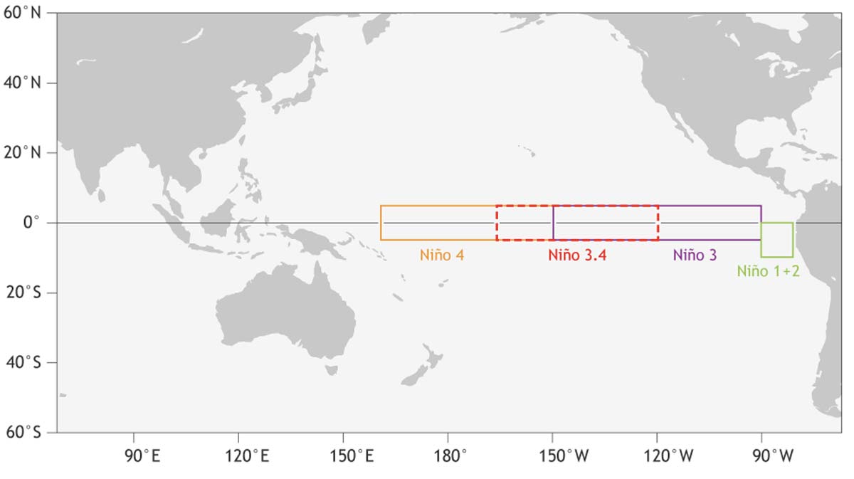 Figura 1. Secciones del Océano Pacífico donde se estima el índice de El Niño, mismo que se deriva de la oscilación de la temperatura de la superficie del mar con respecto al promedio histórico. Un aumento indica un año de El Niño, mientras que una disminución hace referencia a la presencia de La Niña. En la actualidad existen cuatro índices diferentes, aunque normalmente El Niño 3.4 es el más utilizado. Figura cortesía del National Oceanic and Atmospheric Administration (NOAA)