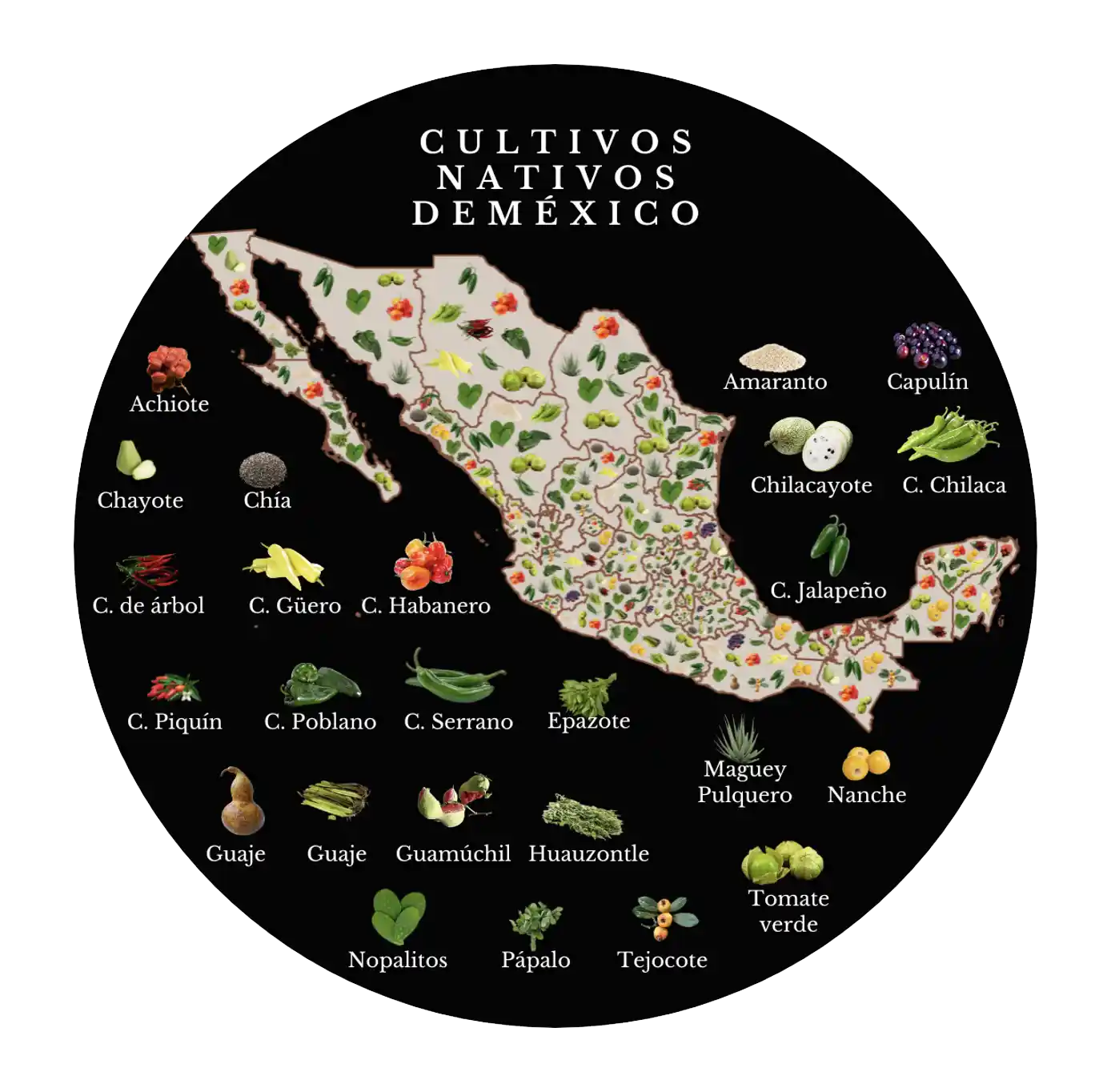 México se caracteriza por su impresionante diversidad geográfica, climática y cultural, lo que ha dado origen a la domesticación y uso de una amplia gama de cultivos nativos, es decir, aquellos cuyos origen y diversificación se encuentran casi exclusivamente en nuestro país. Se trata no sólo del maíz, el chile y el frijol, sino de plantas como el achiote, los nopales —y las tunas—, los guajes, el amaranto, el tomate verde, el chile jalapeño, estos ingredientes conforman la base de numerosas recetas tradicionales mexicanas.