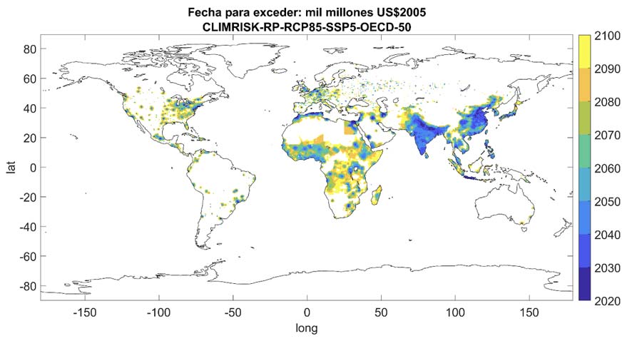 Figura 1. Fechas estimadas para exceder pérdidas superiores a los mil millones de dólares por cambio climático.