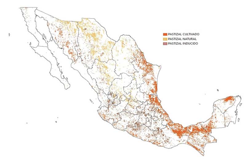 Figura 2. Distribución de los pastizales naturales, inducidos y cultivados en México en 2016