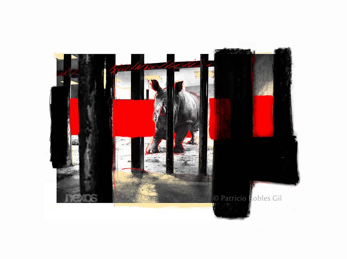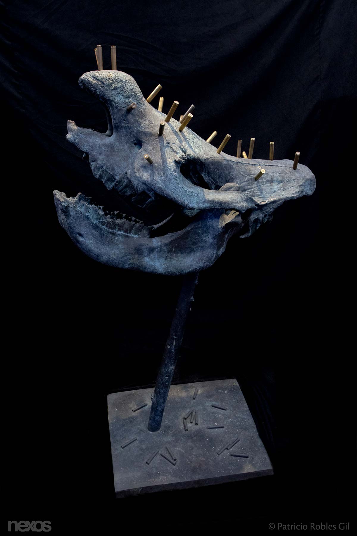 En el Congo Africano existe la tradición de hundir clavos en una figura humana de madera para maldecir a una persona. Pensando en ese ritual, Patricio Robles Gil quiere convertirnos en una especie de chamanes-brujos de esta nueva era del Antropoceno. Diversos colegas, escritores, artistas y conservacionistas hemos intervenido el cráneo de bronce de un rinoceronte blanco a través de una perforación realizada con un taladro; en el agujero creado, clavamos un casquillo vacío de arma de alto poder, y dejamos dentro de él un pequeño papel con un pensamiento escrito a mano sobre el ritual. De esta manera estaremos maldiciendo a los poachers, a los furtivos.