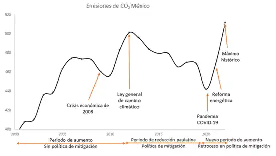 No obstante, toda esta historia no se basa únicamente en críticas informadas. Existe evidencia contundente que demuestra el impacto de las políticas energéticas en la mitigación del cambio climático: el total de las emisiones nacionales de CO2. Estos datos son objetivos, medibles y replicables. Se obtienen a partir de factores de emisión y uso de combustibles fósiles, mediante satélites, con mediciones atmosféricas directas y modelos de transporte atmosféricos. En otras palabras, tienen una altísima certidumbre, proveniente de una plétora de observaciones independientes. Estos datos muestran un aumento claro e inequívoco de las emisiones de CO2 en los últimos dos años. De hecho, los niveles para 2022 son los más altos en la historia de nuestro país.