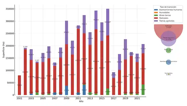 Figura 1. Superficie anual de deforestación bruta por tipo de transición y porcentaje de superficie deforestada por tipo de transición a nivel nacional (2001-2022).
