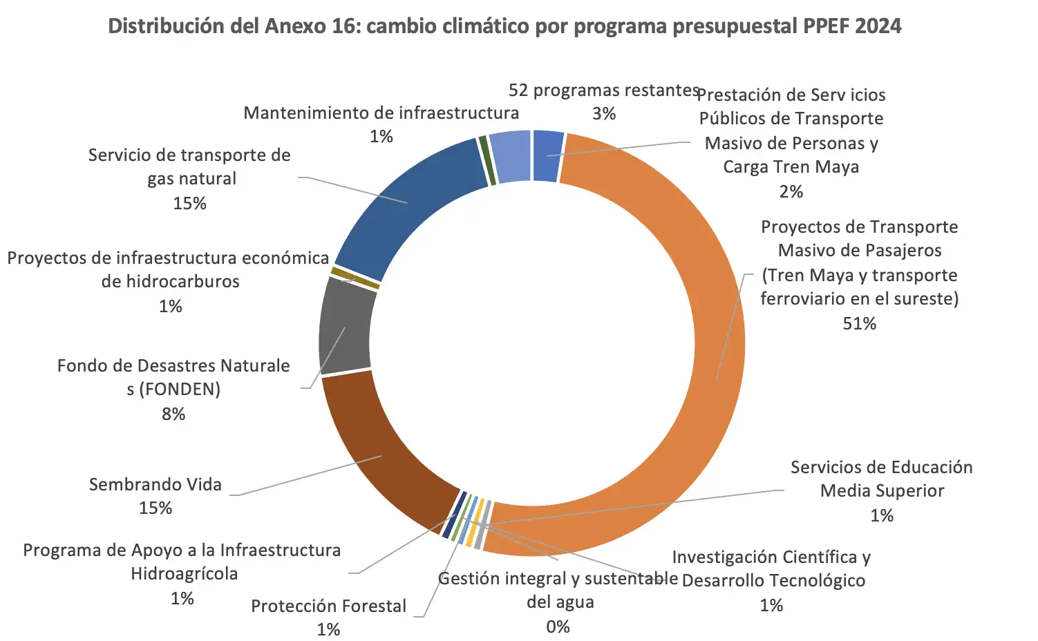 Para 2024, el proyecto de presupuesto (PPEF), destina más de 233 000 millones de pesos a la mitigación y adaptación al cambio climático. Los programas presupuestarios que más recursos absorberán son el proyecto de Transporte Masivo de Pasajeros, el cual busca impulsar infraestructura ferroviaria en el sureste del país (Tren Maya) con el 51 % de los recursos del anexo; el programa Sembrando Vida con el 15 %; el programa de servicio de transporte de gas natural con el 15 %, entre otros. En la siguiente figura se muestra el desglose de dichos programas.