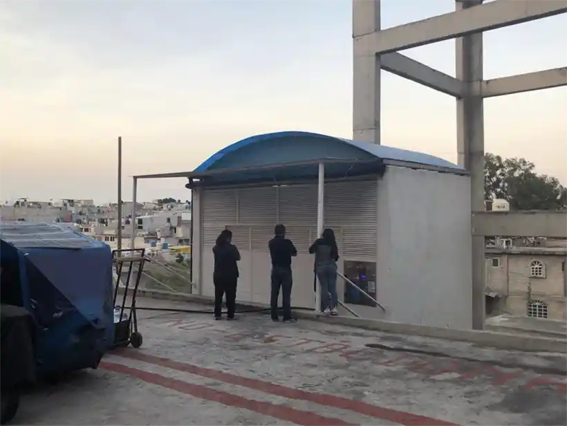 Miembros de la comunidad afuera de la planta potabilizadora de agua en Acapatzingo