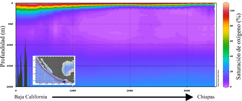 Aunque en México no se han registrado zonas muertas permanentes como en algunos países desarrollados, existe una región en el océano donde la saturación de oxígeno es menor al 20 %, lo que provoca una hipoxia severa. Esta zona, conocida como “zona de mínimo oxígeno”, se encuentra entre los 200 y 1000 metros de profundidad, frente a las costas del Pacífico mexicano. La saturación de oxígeno superior al 80 %, óptima para la vida marina, sólo cubre una franja delgada de entre 0 y 100 metros de profundidad en el Pacífico mexicano. En las costas de Chiapas, Oaxaca, Guerrero y Michoacán, esta capa de oxígeno disuelto tiene un espesor de entre 0 y 50 metros. Conforme se avanza hacia el norte, su espesor aumenta hasta alcanzar los 150 metros en Baja California.