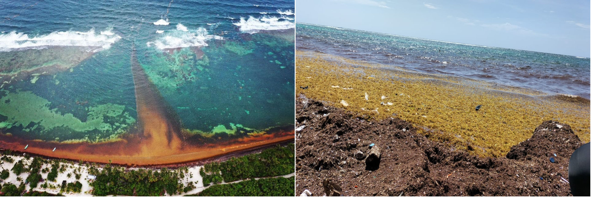 Imagen 1 y 2. Arribo de sargazo pelágico a las playas del Caribe mexicano